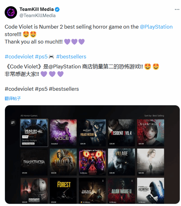 近期PS商店恐怖游戏销量榜迎来意外变局——开发商TeamKill Media旗下新作《Code Violet》成功登顶榜单第二,官方也于今日正式发文庆祝这一成绩。要知道这款游戏自公布以来就争议不断、普遍不被外界看好,甚至被预测销量惨淡,此次能跻身销量前列,堪称一场出人意料的逆袭。