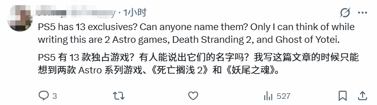 更多玩家则将话题聚焦于PS5当前的独占游戏现状,纷纷开启调侃模式。有玩家疑惑发问:“PS5真的只有13款独占游戏吗?有人能完整列出来吗?我现在能想到的就只有《宇宙机器人》《死亡搁浅2》和《羊蹄山之魂》这三款。”还有玩家补充道:“说13款都多了——毕竟这些所谓的独占,最后基本都会登陆PC,说白了没几款是真·独占。”甚至有玩家拿其他主机对比:“现在Switch2的独占游戏阵容都比PS5丰富,索尼这处境确实有点尴尬。”