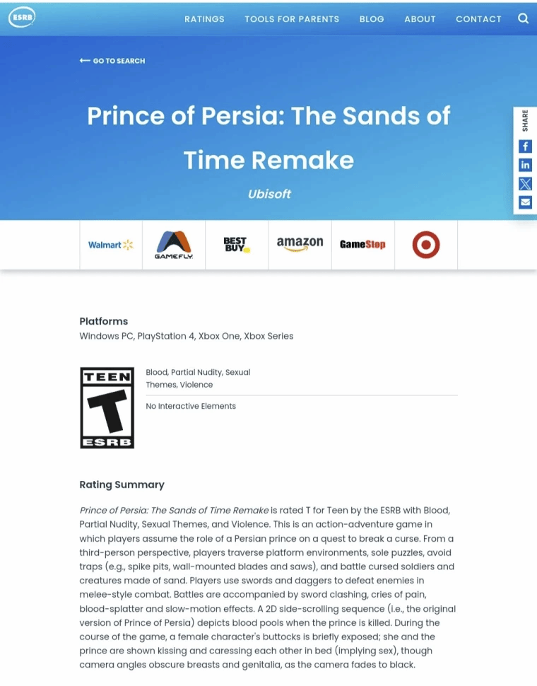 《波斯王子:时之砂重制版》的发售进程再生波澜。继前几日该作现身美国娱乐软件分级委员会(ESRB)数据库、获得T级(青少年级,适合13岁以上)评级,让玩家以为发售临近之际,外媒Insider Gaming最新报道显示,ESRB已悄然撤下了这款游戏的全部评级信息,截至发稿时,在ESRB官网已无法检索到任何相关记录。