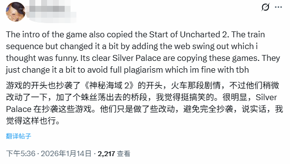 除这一争议点外,外网玩家群体中又出现新的讨论声——有玩家称游戏里另一段列车坠毁的剧情演出,与《神秘海域2》中的列车相关桥段高度相似。这些玩家表示:“这两段动画演出的核心情节完全一致,都是列车发生事故后脱轨下坠,玩家需要从列车尾部逃离并紧紧抓住栏杆,几乎是如出一辙。”