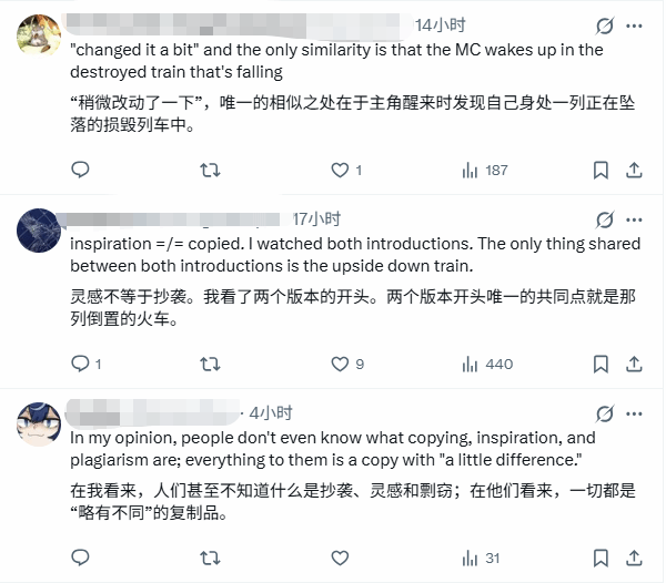 不过,更多玩家对此持有不同看法。他们反驳称,所谓“略有调整”的说法并不准确,这两段内容的共性仅在于“主角+列车损毁坠落”的基础设定,这样的通用情节根本达不到抄袭的程度。