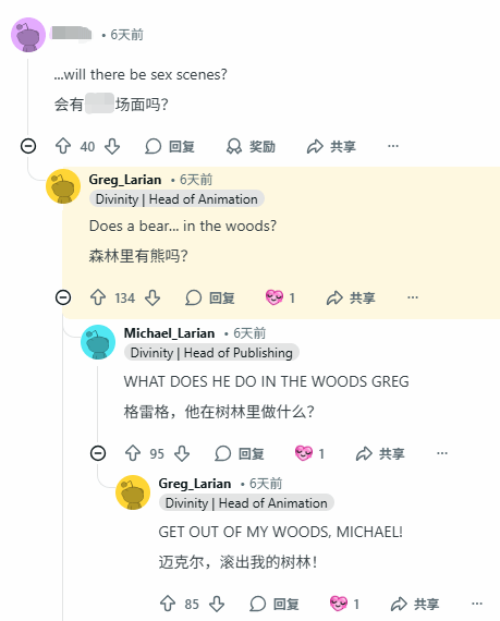 活动中,有玩家发问:“《神界》新作是否会包含成人内容?”面对这一问题,拉瑞安工作室动画总监Greg并未给出直白回应,而是抛出了一句看似无厘头的话:“熊在树林里…吗?”