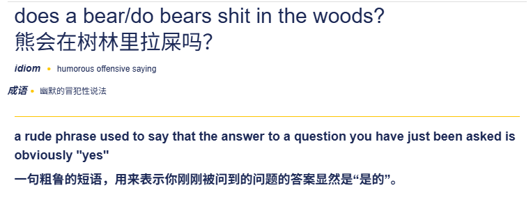 查阅相关资料可知,这句话源自英语谚语,完整表述为“Does a bear shit in the woods?”,其含义等同于“答案显而易见是肯定的”,通俗来讲就是“这还用问吗?”。