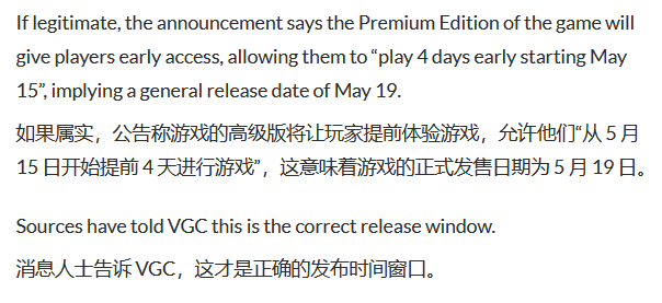 随后,外媒VGC针对这一消息发布报道,并明确表示其消息渠道已核实确认,5月19日这一发售日期准确无误。