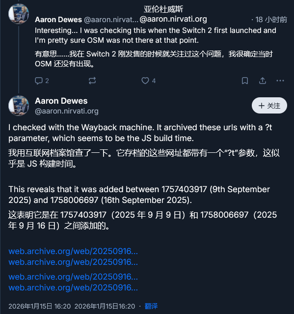 这位网友补充说明,该门户网站会为每款机型配备专属对应图片,而当他查询OSM代号时,系统返回的却是Switch 2的机身图片,这一细节让代号背后的含义更显扑朔迷离。随后,网友@aaron.nirvati.org 也分享了自己的观察,他表示在Switch 2刚官宣时就持续关注该网站,当时并未出现OSM这一代号。为验证时间线,他借助Wayback Machine(网站时光倒流机)调取了页面历史存档,依据时间戳判断,这一代号大概率是在2025年9月至9月16日期间被添加至网站后台的。