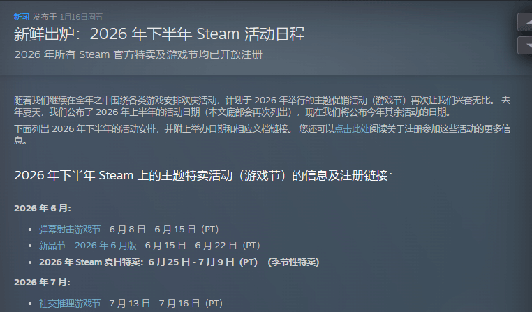 10月堪称促销与主题盛宴,秋季特卖(10月1日-10月8日,PT)、烹饪游戏节(10月12日-10月19日,PT)、10月版新品节(10月19日-10月26日,PT)及第五届Steam尖叫游戏节(10月26日-11月2日,PT)依次登场。11月除自走棋角色扮演游戏节(11月16日-11月23日,PT)外,还将重点引导流量至“折扣与活动”中心,聚焦黑色星期五游戏折扣,具体细节暂未公布。年末冬季特卖则定于12月17日至2027年1月4日(PT),为全年活动收尾。