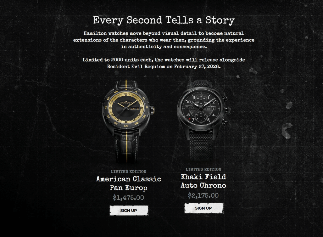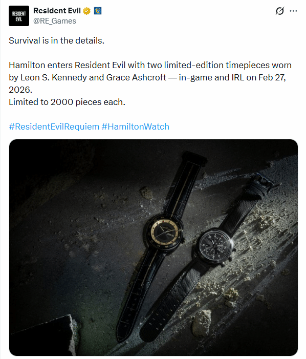 知名腕表品牌汉米尔顿通过官方推特,正式宣布与《生化危机9:安魂曲》展开跨界合作,推出两款限定联名腕表。此次联名款式全球限量发售2000枚,品牌还搭配了“生存藏于细节”的宣传语,为产品增添IP氛围感。