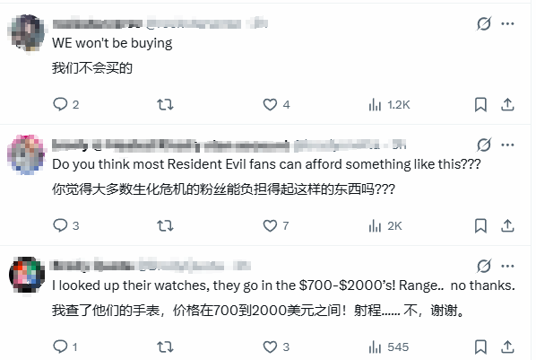 两款联名腕表的定价分别折合人民币6499元与9560元,这样的价位让不少系列粉丝望而却步。联名消息公布后,评论区迅速被吐槽声覆盖,多数网友直言定价过高,远超普通玩家的承受范围,即便怀揣对《生化危机》系列的情怀,也难以入手这款联名周边。