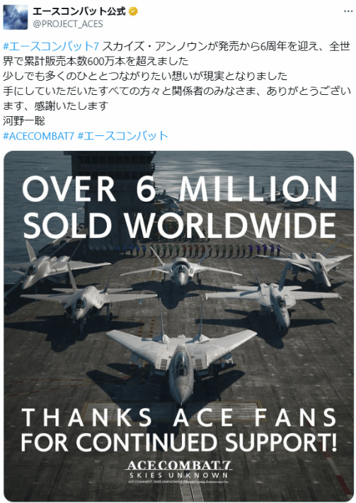 《皇牌空战7:未知空域》已登陆PS4、Xbox One、Switch及PC四大平台,各版本均收获玩家认可。其中Switch版虽在分辨率等视觉表现上有所调整,但凭借稳定的帧率优化和对核心玩法的完整保留,成为平台上优质的空战游戏选择,也为销量增长提供了助力。制作人河野一聪也同步在社交平台向全球玩家表达了感谢,回馈粉丝多年来的支持。