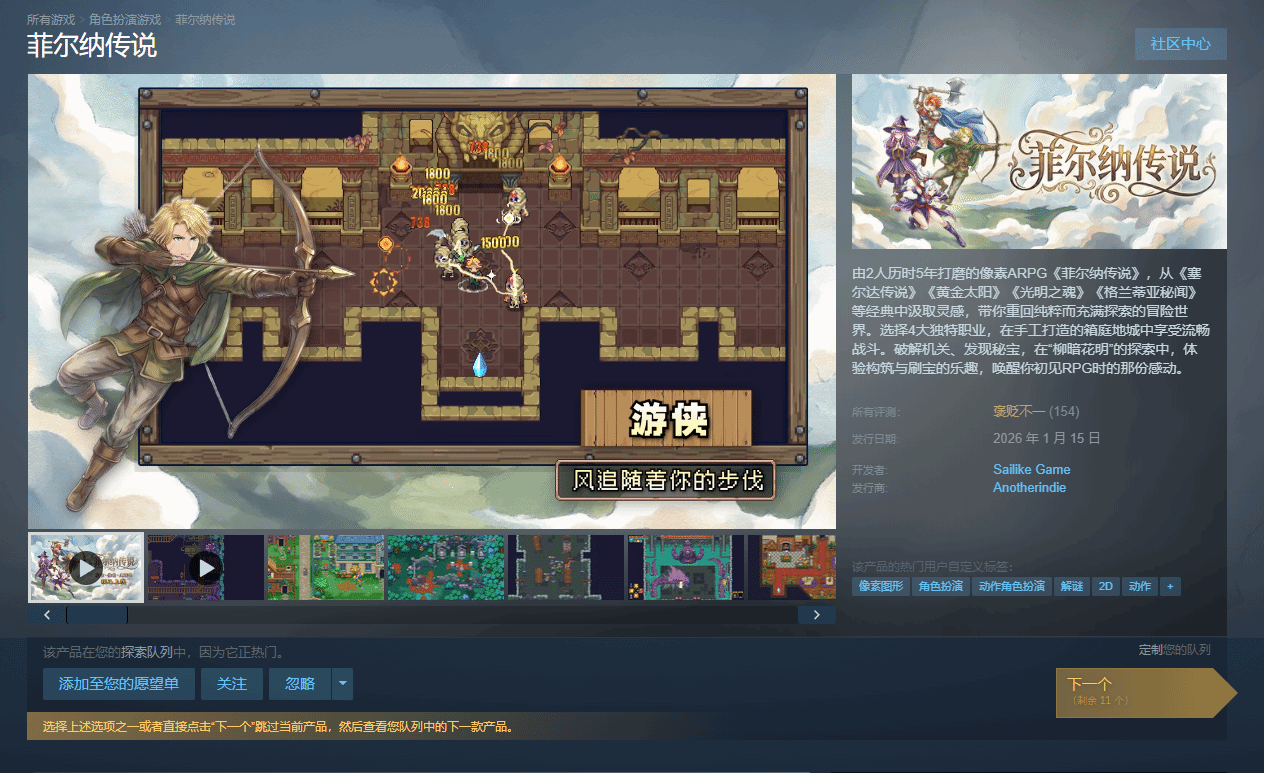 据外媒automaton-media报道,在半成品游戏泛滥、早期访问模式盛行的当下,独立工作室Sailike Game逆势而为,耗时五年潜心打磨了单机动作RPG《菲尔纳传说》,由Another Indie负责发行,现已正式登陆Steam平台。这款仅由两人团队打造的作品,摒弃了繁杂的宣传造势,凭借扎实的内容体量主打体验为王。