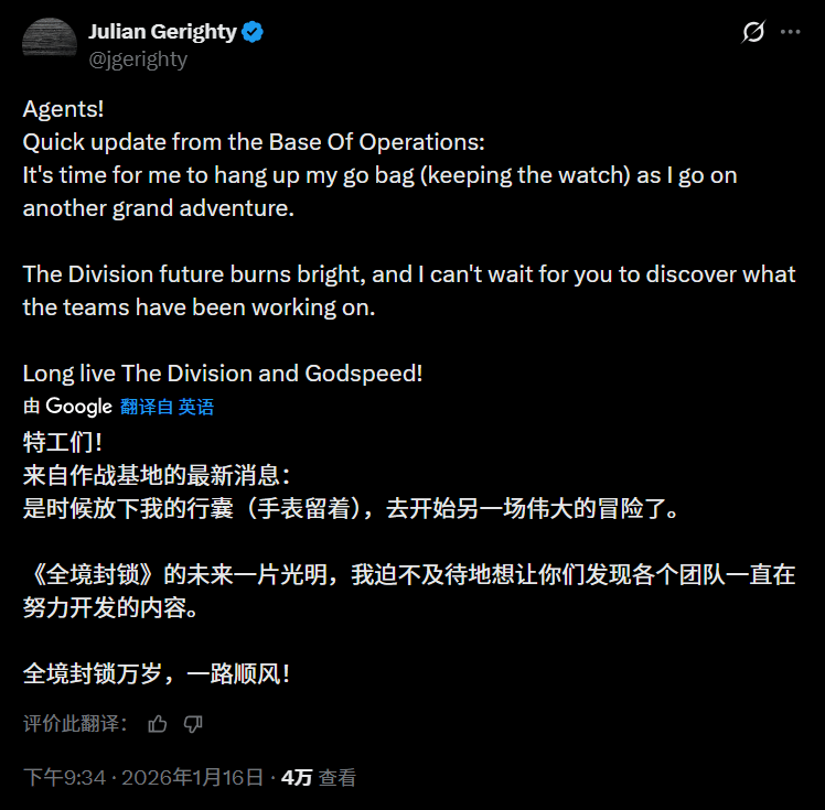 育碧Massive Entertainment工作室制作总监朱利安·杰拉提,已正式官宣离开团队,转头加入《战地》系列开发商DICE。而仅仅一周前,他还在New Game+展示会上为未发售的《全境封锁3》站台背书,这番前后反差让这款被他称作“怪兽级作品”的新作,蒙上了一层不确定性。