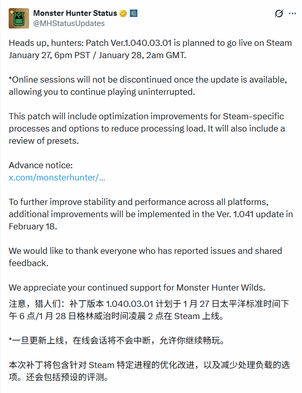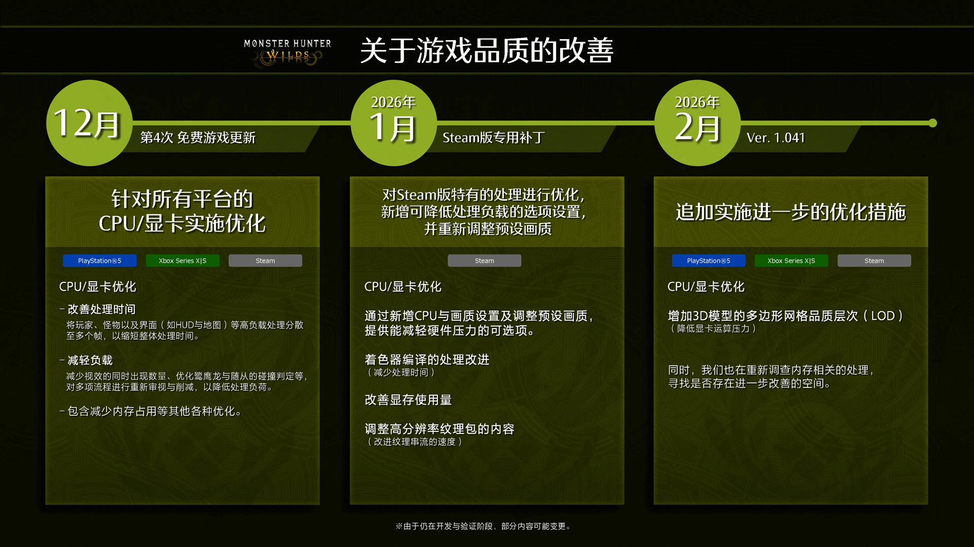 卡普空已正式敲定《怪物猎人:荒野》PC版第二款性能优化补丁的上线时间,将于1月28日北京时间凌晨1点推送。这款Steam专属更新,将聚焦玩家诟病已久的硬件负载问题,带来全方位的体验提升,此前上月该团队已推出三款性能更新计划中的首款。
