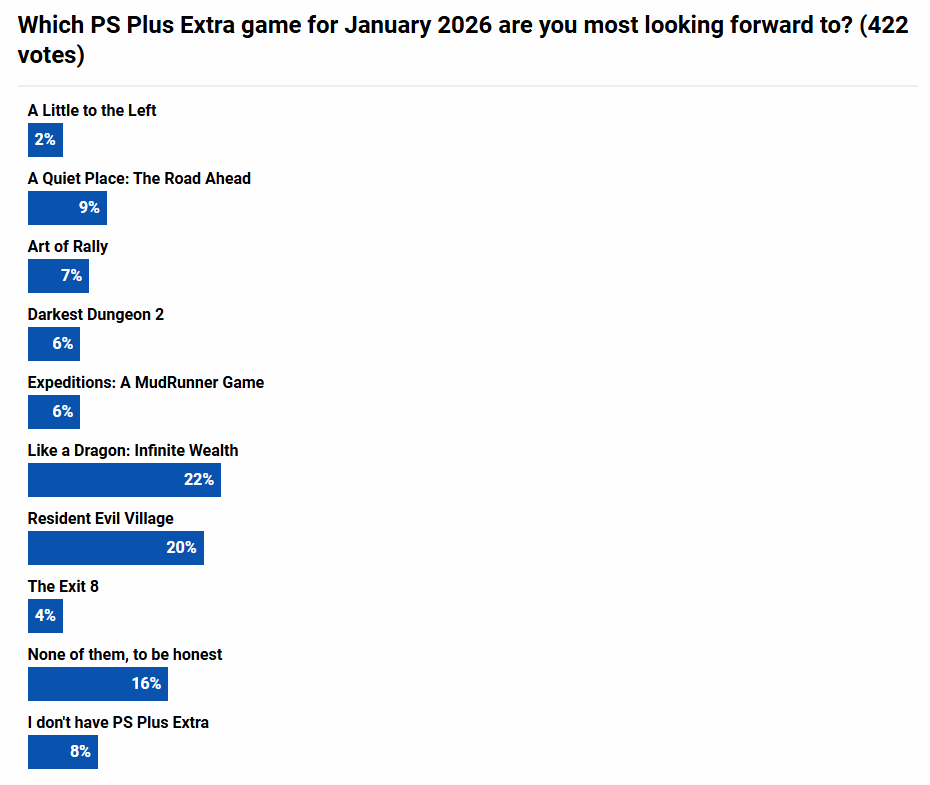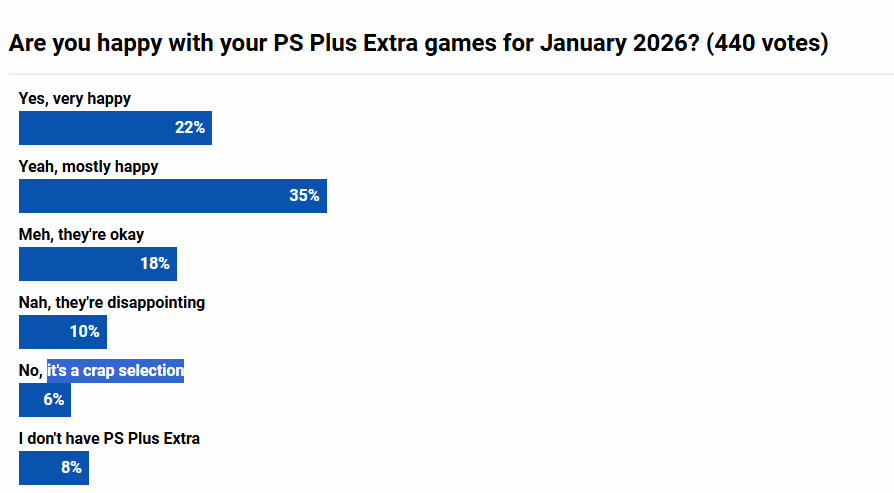 这份游戏名单为索尼这项订阅服务的2026年开了个好头。海外媒体pushsquare此前发起相关调研,了解玩家对该批次游戏阵容的满意程度。截至报道发出时,已有440名玩家参与其中,调研结果显示:35%的玩家表示基本满意,22%达到非常满意,18%予以认可,10%感到失望,另有6%给出负面评价。作品热度方面,《如龙8》成为本次阵容中最受玩家青睐的一款。