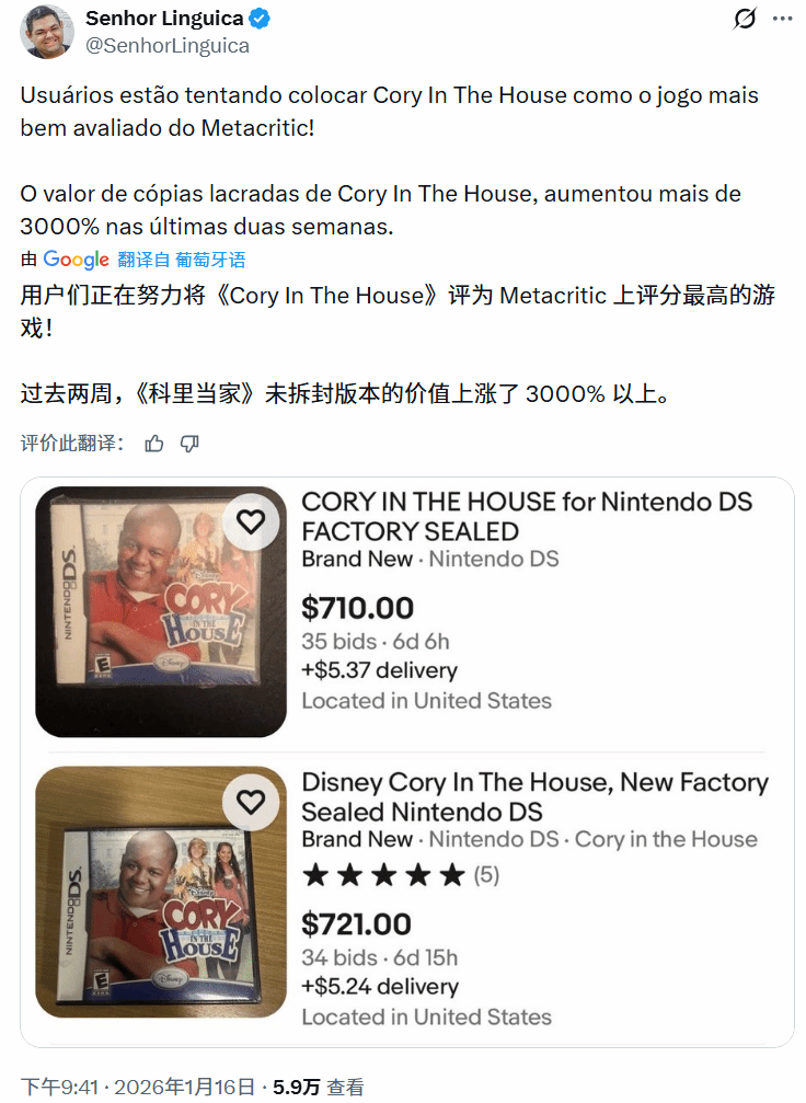 近日,推主@SenhorLinguica分享的信息显示,过去两周内,《寇利进白宫》未拆封实体版本的市场价值飙升幅度超过3000%。从相关图片能看出,该款未拆封游戏的售价已突破710美元,折合人民币约4590元。