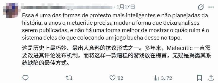 不过也有玩家给出犀利观点:“这无疑是史上最巧妙且无预设的抗议方式。Metacritic的评分发布机制多年来早该优化调整,而让这样一款水准平庸的游戏登顶评分榜,恰恰暴露了其系统存在的漏洞——这种黑色幽默式的结果,堪称最到位的讽刺。”
