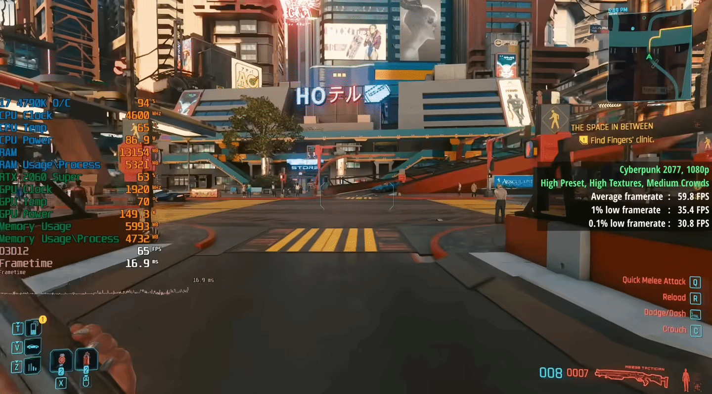 作为濒临淘汰的内存规格,DDR3 1866MHz的带宽与延迟早已落后于DDR4、DDR5,而《赛博朋克2077》这类3A游戏又对内存性能需求较高,这套配置能跑出60帧实属不易。但性能瓶颈也十分明显,典型的“低U高显”搭配让i7-4790K难以支撑RTX 2060 Super全力输出,显卡性能被大幅限制。