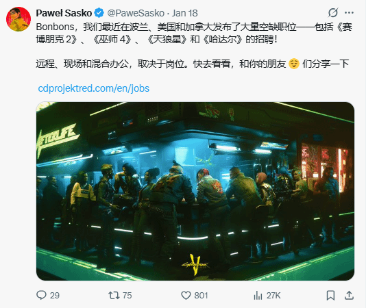 外媒Playground报道,《赛博朋克2077》开发商CDPR的副总监帕维尔·萨斯科(Pawel Sasko)近日在X平台发布公告,宣布工作室已在波兰、美国及加拿大的办公地点同步开放大批岗位招聘,引发行业关注。