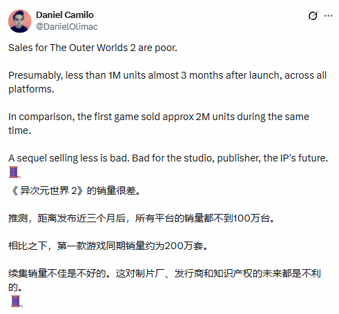 Camilo通过对比系列两代作品的同期数据,展现出这一落差明显的表现:初代《天外世界》上市相同周期内,销量约达200万份;而《天外世界2》发售三月后的推测销量,连前作的一半都未达到。“续作销量不及前作,无论对开发工作室、发行方,还是这个IP的后续发展,都是相当不利的信号。”Camilo这样表示。