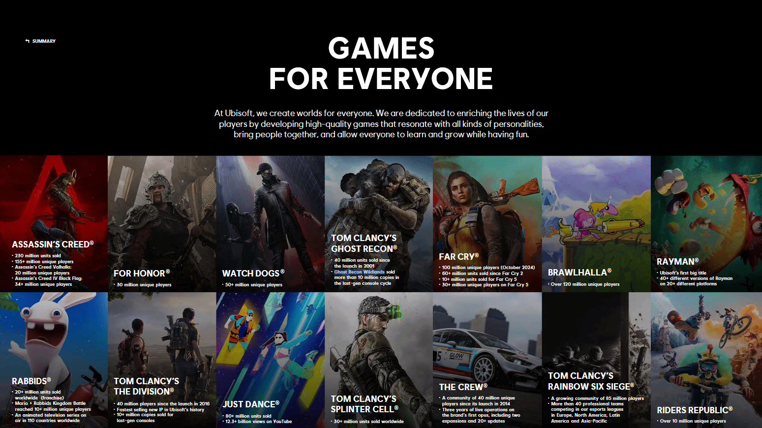 育碧首个核心原创IP《雷曼》,已跨20多个平台推出40余个版本。《疯狂兔子》系列全球销量超2000万份,《马里奥疯狂兔子:王国之战》玩家破1000万,改编动画覆盖110个国家。《细胞分裂》系列销量也破3000万份,成经典战术IP。
