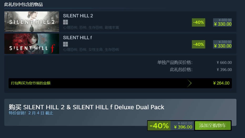 Steam平台上架的《SILENT HILL 2 & SILENT HILL f STANDARD DUAL PACK》捆绑包开启限时优惠,将两款热门恐怖游戏打包发售,性价比远超单独购入。