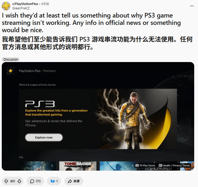 PS3游戏串流是PS Plus Premium套餐的核心功能之一,也是支撑其较高订阅价格的重要亮点。如今服务中断已达四天,索尼方面仍未针对此事给出正式说明,也未告知具体修复时间,这一态度引发了订阅用户的普遍不满。