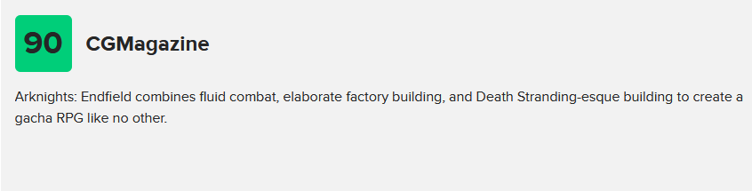 CGMagazine给出90分,认为游戏融合流畅战斗、丰富工厂搭建与类《死亡搁浅》建造玩法,打造出极具辨识度的抽卡RPG,特色鲜明。