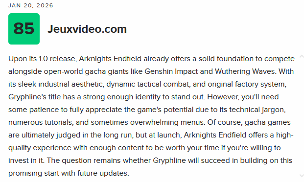 Jeuxvideo.com打出85分,称其1.0版本已具备与《原神》《鸣潮》同台竞技的实力。冷峻工业风美术、兼具动感与战术性的战斗,以及原创工厂玩法,让游戏标签清晰。但媒体也提及,游戏专业术语多、新手引导密集、菜单繁琐,需玩家耐心挖掘潜力。