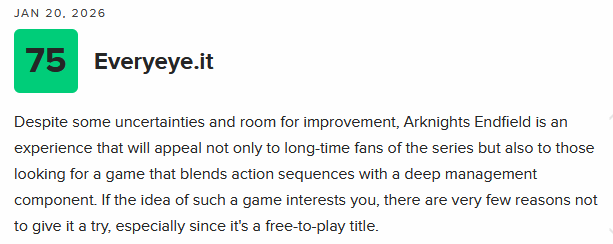 Everyeye.it给出75分,认为游戏虽有优化空间,但能吸引系列老玩家及喜爱“动作+深度经营”的新用户,免费游玩属性更值得该类型爱好者尝试。