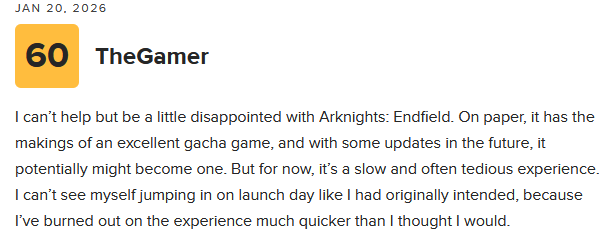 TheGamer仅打60分,坦言感到失望。其表示游戏理念具备爆款潜质,后续更新或可逆袭,但当前节奏拖沓、体验乏味,首发阶段便产生倦怠感,难以持续投入。