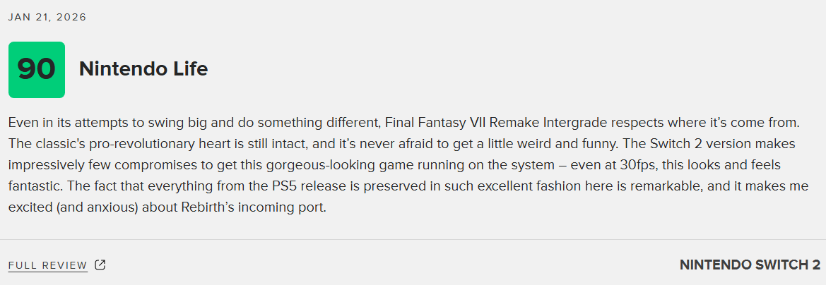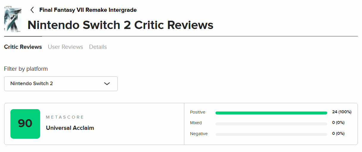 《最终幻想7:重制版Intergrade》将于本周四登陆任天堂Switch 2与Xbox Series X|S平台。目前Switch 2版本的媒体评测已正式解禁,知名评分网站M站汇总了24家媒体的评价,最终给出90分的均分,实现全好评零差评的亮眼成绩。