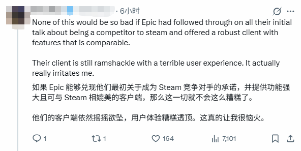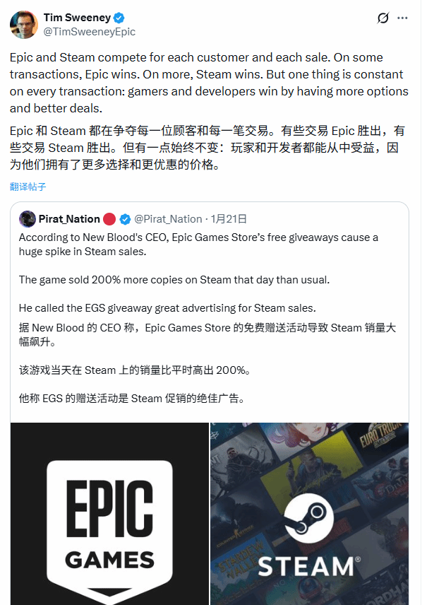 蒂姆·斯温尼表示:“Epic与Steam始终在争夺每一位用户和每笔订单。有些场景下Epic更占优,有些时候则是Steam胜出。但核心不变的是,玩家与开发者都能从中获利,毕竟他们拥有了更多选择,也能享受到更实惠的价格。”