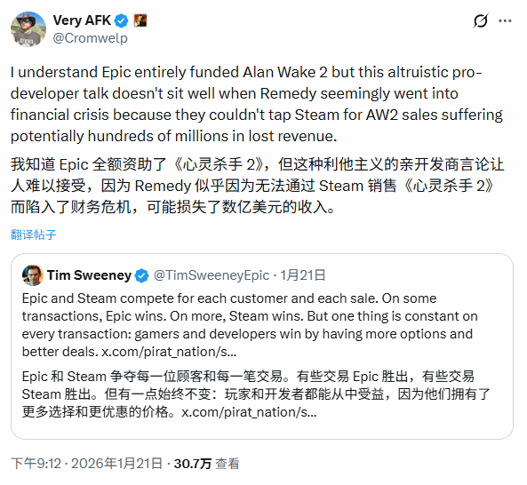 这番言论很快遭到反驳,《神界》《博德之门3》开发商拉瑞安工作室的发行总监迈克尔·杜斯直接作出回应,直指其言论矛盾。“我清楚Epic为《心灵杀手2》提供了全额开发资金,但这种看似利他、为开发者着想的说法实在难以令人信服。Remedy显然正因无法登陆Steam发售《心灵杀手2》陷入财务困境,潜在收入可能损失数亿美元。”