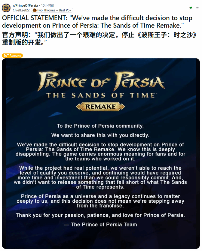 消息传开后,玩家群体反应强烈,核心诉求集中在两点:要么希望育碧直接出让《波斯王子》的版权,要么就认定这个系列已彻底终结。在波斯王子专属Reddit社区的讨论中,用户Moonraker207直言,这次项目叫停“和葬送整个系列没区别”;用户Sweaters76也毫不掩饰失望:“说实话,《波斯王子》这下是真的没救了。”