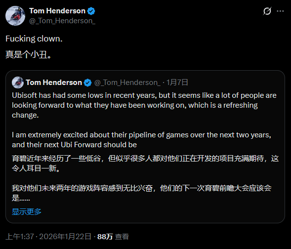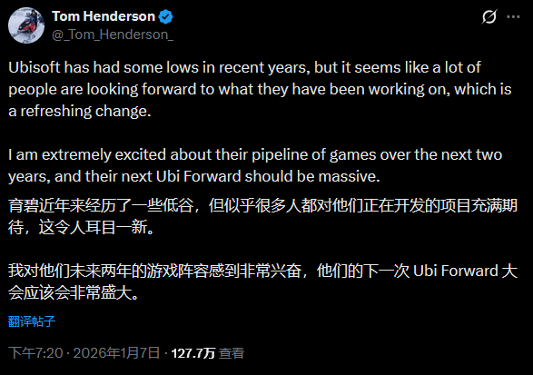消息一出,Insider Gaming创始人兼主编、业内知名爆料人汤姆·亨德森(Tom Henderson)迅速转发了自己1月7日发布的一条推文,配文直指自己“真他*小丑”,满是自嘲与失望。回溯他1月7日的原文,字里行间满是对育碧的看好,俨然一位忠实支持者的口吻:“育碧这几年确实走过不少弯路,但如今外界对他们正在推进的项目关注度显著回升,这种转变让人眼前一亮。我对育碧未来两年的游戏矩阵充满期待,他们下一场Ubi Forward发布会,说不定会带来超有分量的内容盛宴。”