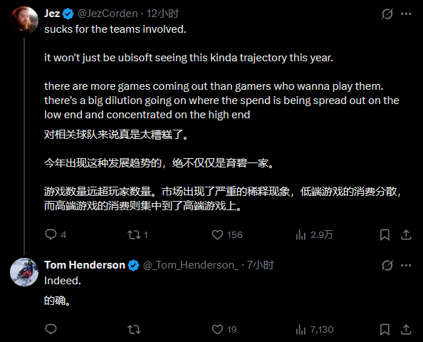 这番前后反差鲜明的操作,显然是汤姆在嘲讽彼时对育碧抱有乐观期待的自己,言语间尽显被现实打脸后的无奈。随后,Windows Central执行编辑、另一位业内资深人士杰兹·科登(Jez Corden)也对此条转发进行了回复,他表示:“这种情况对涉事开发团队来说无疑是沉重打击,而且今年陷入这种困境的,绝非育碧一家厂商。”