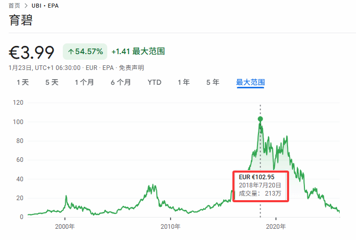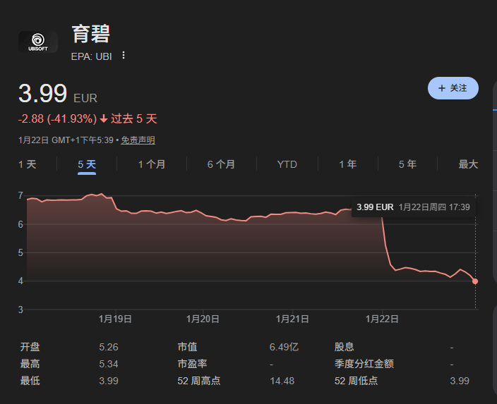 利空消息密集释放后,育碧股价随即迎来断崖式下跌。1月22日当天,股价相较近期波动基准暴跌约30%;1月23日颓势未止,股价进一步下探至3.99欧元,单日跌幅再扩至约40%,市值也随之一路缩水,截至23日定格在6.49亿欧元。