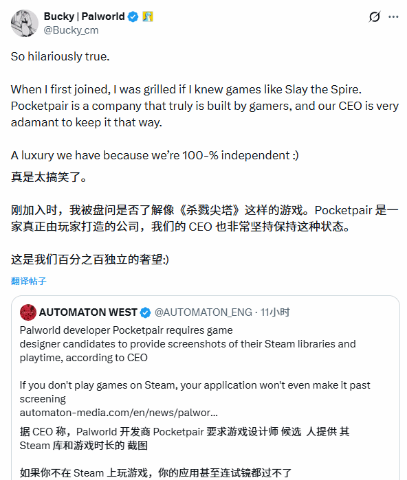公司发行与传播负责人约翰·“巴基”·巴克利也分享了自身经历,佐证了这一招聘文化的根深蒂固。“我刚加入公司时,就被反复追问是否了解《杀戮尖塔》这类作品。” 他表示,Pocketpair本身就是一家由真正玩家组成的团队,而沟部拓郎始终坚定地守护这一核心特质。同时巴克利也提到,这种“只招玩家”的招聘方式,得益于公司100%独立运营的优势,才有底气设立这样的门槛。