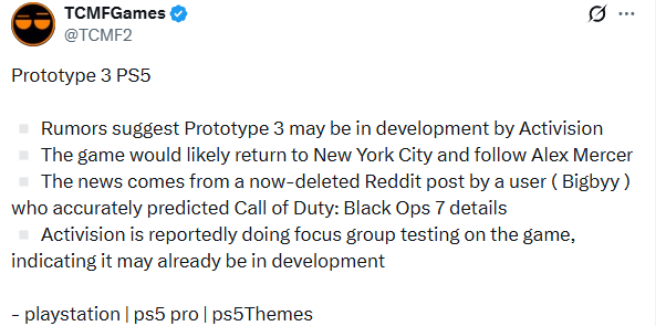 此次传闻的核心信源来自Reddit平台用户Bigbyy,其发布的相关帖子虽已被删除,但该用户过往曾精准预判《使命召唤:黑色行动7》的核心细节,让这份爆料具备了较高可信度。根据泄露内容,《虐杀原型3》不仅确定由动视主导开发,剧情还将回归系列经典舞台纽约市,继续围绕初代主角A哥展开主线叙事,唤醒老玩家情怀。