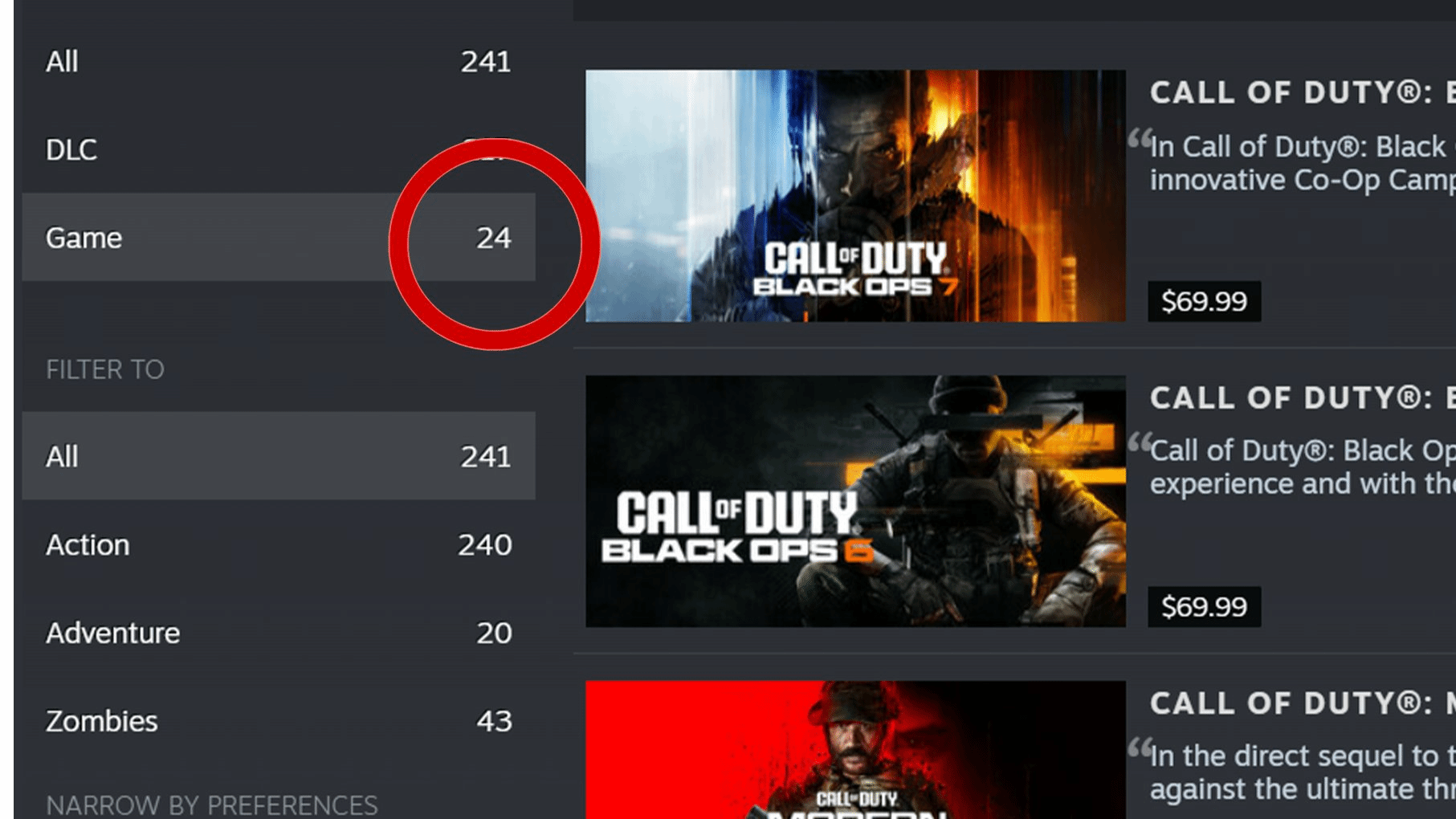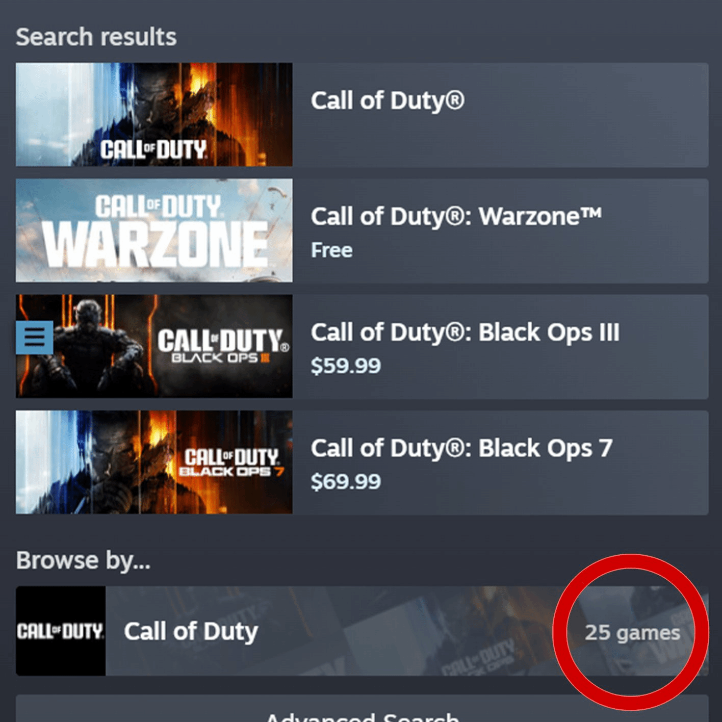 具体来看,《使命召唤》官方系列Steam页面的头图标注该系列包含25款作品,但交互时却出现数据矛盾:点击标题后,游戏计数器会自动修正为当前实际可购的24款,而页面列表中实际展示的数量仅为23款——原版《现代战争3》莫名从列表中“隐身”。在玩家与业内的普遍认知中,这种旧条目异常消失、数据无法对应 的情况,通常意味着官方正筹备用新版本替换旧内容,这也让《现代战争3》重制版的传闻有了实质性线索支撑。