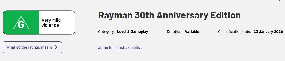 这条于2026年1月22日录入的评级信息,对应的作品名为《Rayman 30th Anniversary Edition》(《雷曼30周年纪念版》),开发与发行方标注为Atari,申请方则是UI Entertainment。在游戏行业中,分级信息的提前曝光往往是作品即将官宣的重要信号,尤其恰逢系列30周年的特殊节点,这一动态更让玩家对周年作的期待值拉满。