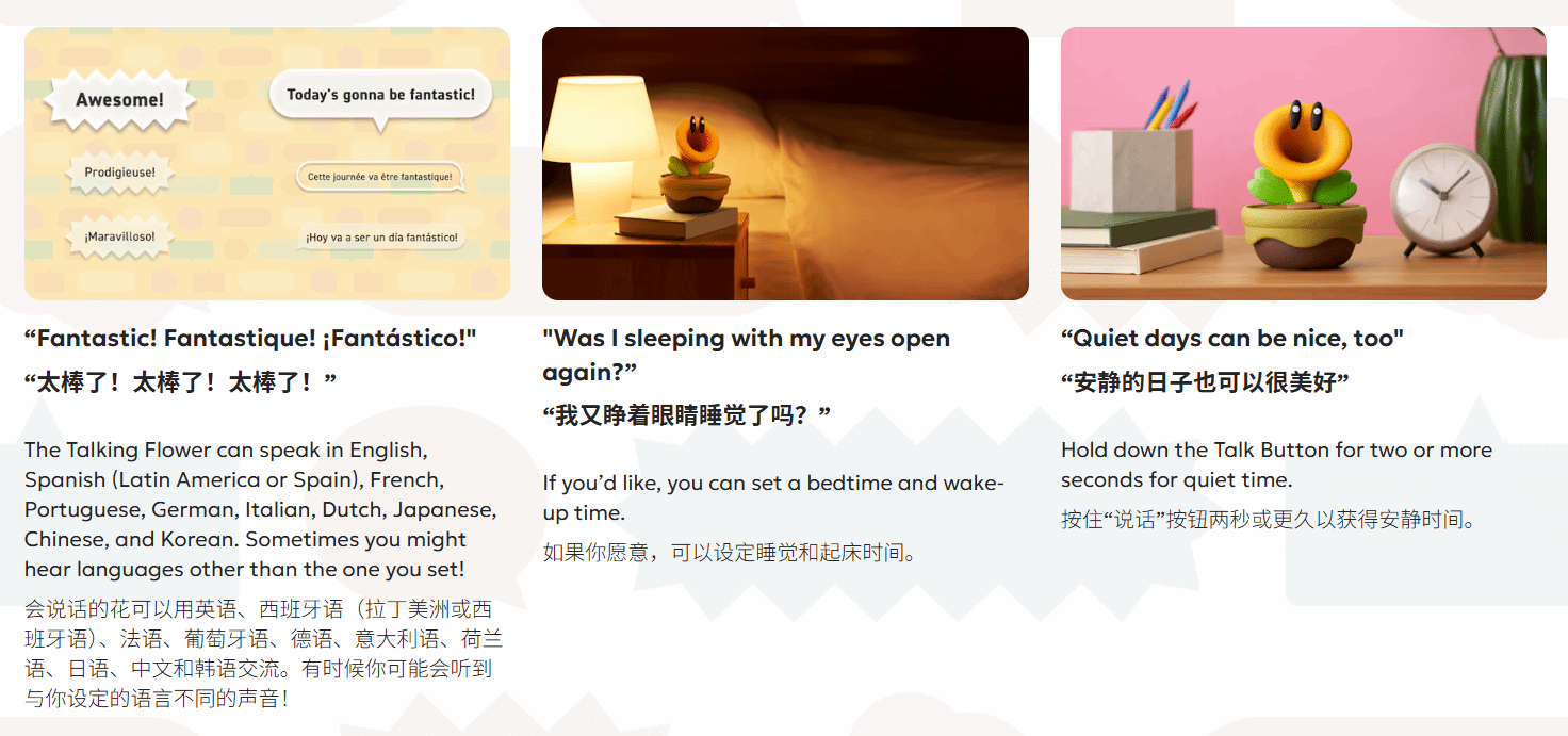 这款实体花延续了喋喋不休的特点,日常会主动播报时间、室温,结合时段说鼓励或俏皮话,按聊天按钮可触发随机话术及游戏经典台词、背景音,还支持含汉语在内的11国语言。