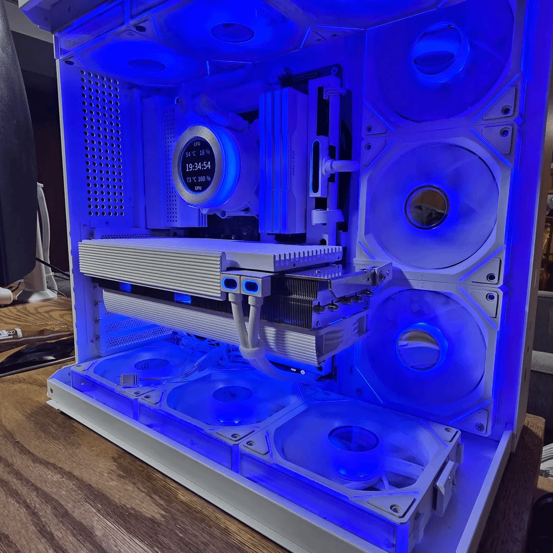 随后,该玩家从铝制废料堆中挑选了一款体积硕大的汽车功放散热器,将其切割打磨至与显卡匹配的尺寸后进行适配安装,还喷涂了白色耐高温珐琅漆,让显卡整体呈现出简洁的白色视觉效果。除了这款核心改装散热器,他还利用铝废料自制了前面板与底部风扇护罩,同时将原装风扇替换为三把92毫米规格的利民RGB风扇,进一步强化散热与颜值。