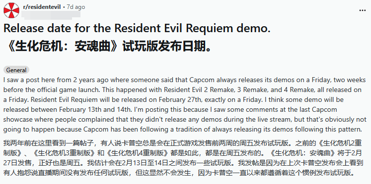 Reddit平台上有玩家分析指出,卡普空大概率会在2月13日周四或2月14日周五这两天,上线《生化危机9:安魂曲》的试玩内容。原因在于,回顾系列过往作品,《生化危机2:重制版》《生化危机3:重制版》以及《生化危机4:重制版》的试玩版,均是在游戏正式发售前两周的周四或周五对外开放。