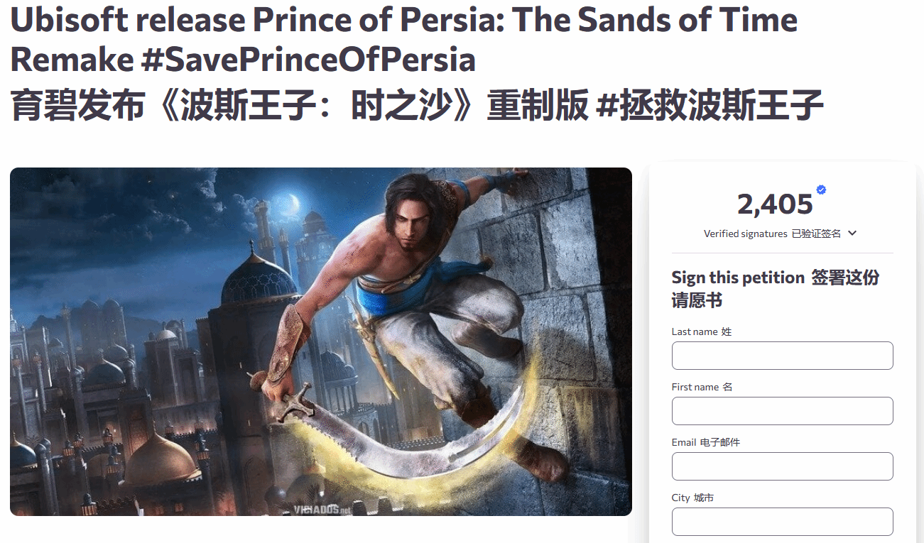 育碧此前大规模战略重组中,多款项目或延期或叫停,开发多年的《波斯王子:时之砂重制版》未能幸免,成为此次调整中唯一被公开名称的取消项目,让无数粉丝扼腕叹息。近日,玩家群体发起联名请愿活动,呼吁育碧重启该项目,截至发稿,已收获2405份有效签名支持。