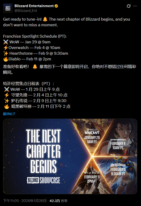 按照规划,北京时间1月30日起,暴雪将接连推出多场重磅展示活动,逐步揭晓品牌下一阶段的发展布局。这场系列活动分设四个独立专场,具体时间(均为北京时间)如下:《魔兽世界》专场定档1月30日凌晨1:00,《守望先锋》专场将于2月5日凌晨2:00开启,《炉石传说》专场安排在2月10日凌晨1:30,《暗黑破坏神》专场则在2月12日早上6:00登场。