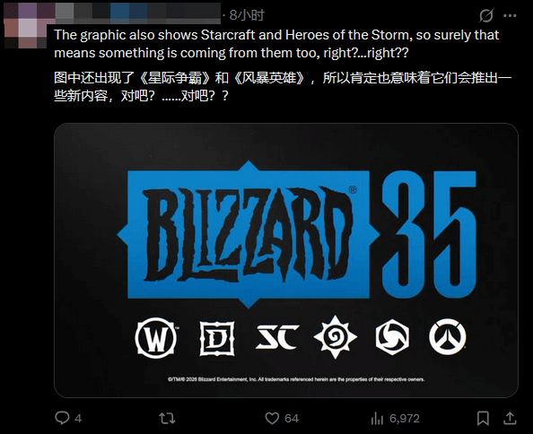 值得关注的是,有粉丝根据暴雪此前发布的35周年纪念视觉图做出推测,认为本次展示内容或许不止四大IP。该视觉图中还出现了《星际争霸》与《风暴英雄》的相关标识,不过这一元素也有可能仅用于其他周年纪念活动,并非本次展示内容,建议玩家保持理性期待。