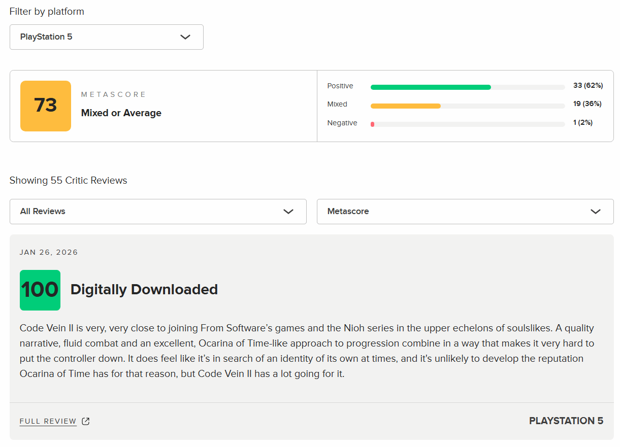 该媒体的评价原文提到:“《噬血代码2》距离跻身FromSoftware作品与《仁王》系列所在的类魂第一梯队已十分接近。扎实的剧情叙事、顺滑的战斗手感,再搭配上媲美《时之笛》的优质成长推进节奏,让人一旦上手就难放下手柄。当然,游戏目前仍在摸索专属自身的独特定位,未必能达到《时之笛》那样的历史性口碑高度,但本身具备诸多可圈可点的优势。”