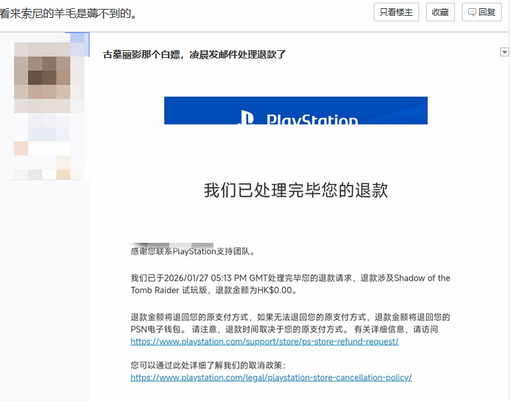 PlayStation商店因技术故障“白送”游戏的后续来了。此前因平台漏洞,原价299港币(约270.5元人民币)的《古墓丽影:暗影》一度可免费领取,索尼当晚紧急修复漏洞阻断了后续“0元购”,而如今,索尼正式启动游戏回收流程,不少玩家发现库中的游戏已被强制移除,伴随的却是“退款0元”的通知。