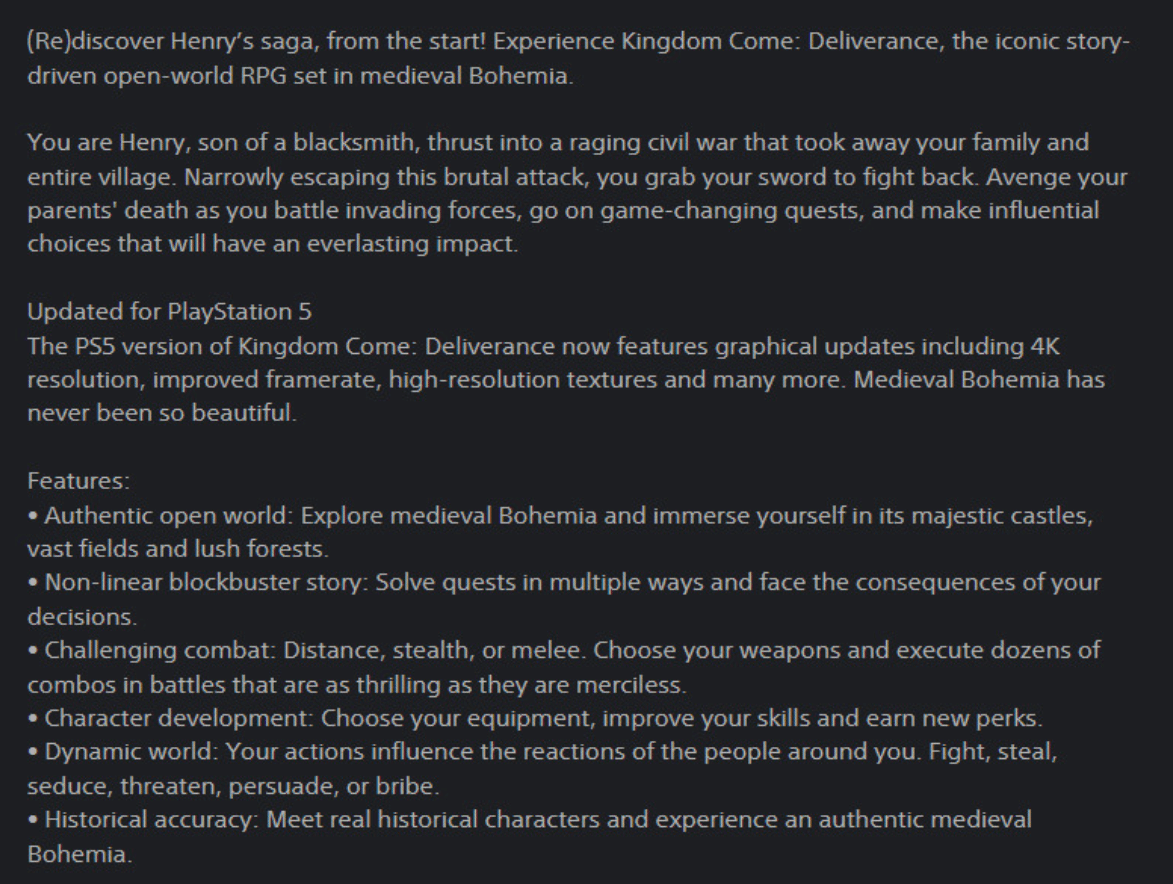 外媒Gematsu率先捕捉到这一泄露信息,页面明确标注了PS5版的核心升级点:支持4K分辨率、更高帧率及高分辨率贴图等图形优化,官方还配文称“中世纪的波希米亚从未如此美丽”。其中“4K+60帧”的规格最受关注,要知道初代《天国:拯救》在旧主机上受硬件性能限制,画面和帧率表现一直不尽如人意,这次升级无疑能大幅提升游戏体验。