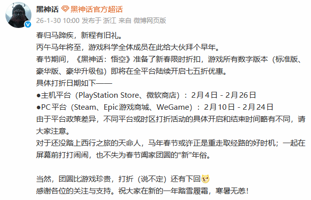《黑神话:悟空》官方正式官宣新春福利,宣布将在丙午马年春节期间开启限时折扣活动,游戏所有数字版本均同步参与促销,开启七五折优惠,这也是该作上线以来的最大力度折扣,创下新史低纪录,未入手的玩家可抓住此次机会。